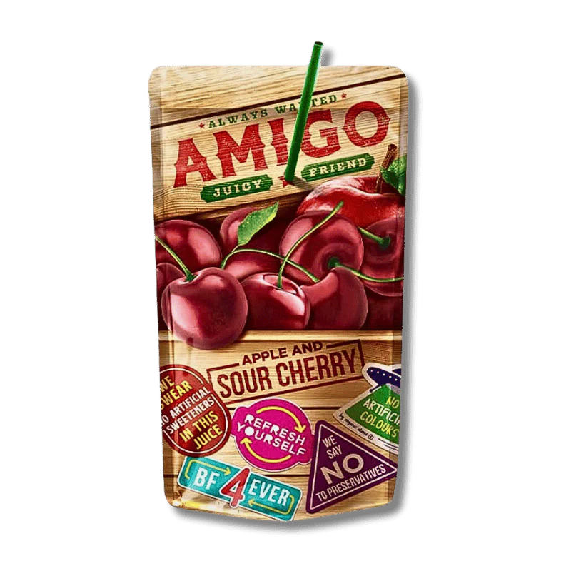 Regulärer Preis 0,49 €Fruchtig, frisch und fruchtig-säuerlich! Amigo Apple & Sour Cherry vereint Apfel mit der spritzigen Note Sauerkirsche – der perfekte Begleiter für unterwegs.