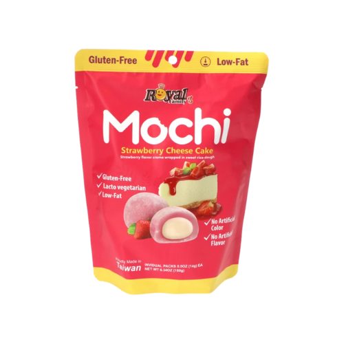 Erlebe eine verführerische Kombination aus fruchtigem Genuss und cremiger Süße mit den Royal Family Mochi Strawberry Cheese Cake! Diese einzigartigen Mochi-Bällchen bestehen aus einem weichen, klebrigen Reisteig, der eine köstliche Füllung aus cremigem Käsekuchen und frischer Erdbeere umhüllt. Der harmonische Mix aus süßem, fruchtigem Erdbeergeschmack und der samtigen Käsekuchenfüllung sorgt für ein Geschmackserlebnis, das einfach unwiderstehlich ist.