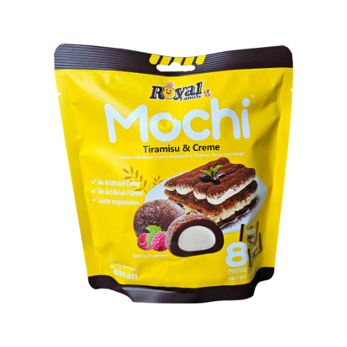 Lass dich von den Royal Family Mochi Tiramisu Creme in die Welt des italienischen Genusses entführen! Diese exquisiten Mochi-Bällchen vereinen die einzigartige Textur von weichem, klebrigem Reisteig mit einer luxuriösen Füllung aus zarter Tiramisu-Creme. Der Geschmack von Kaffee, Mascarpone und einer leichten Süße entfaltet sich mit jedem Bissen und sorgt für ein wahres Geschmackserlebnis – wie ein Stück frisch zubereitetes Tiramisu, nur in einer handlichen, exotischen Form.